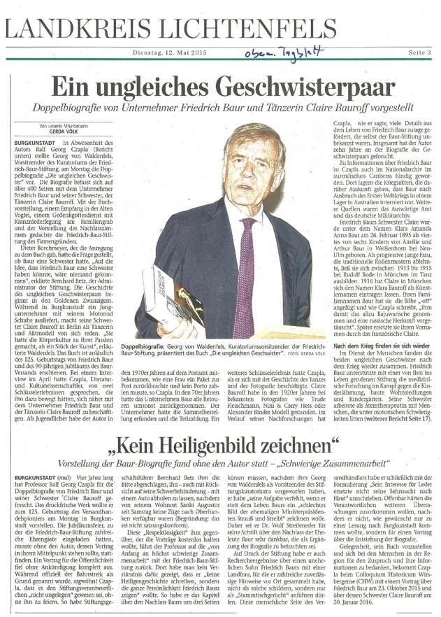 In Abwesenheit des Autors Ralf Georg Czapla (Bericht unten) stellte Georg von Waldenfels, Vorsitzender des Kuratoriums der Friedrich-Baur-Stiftung, am Montag die Doppelbiografie „Die ungleichen Geschwister“ vor. Die Biografie befasst sich auf über 400 Seiten mit dem Unternehmer Friedrich Baur und seiner Schwester, der Tänzerin Claire Bauroff. Mit der Buchvorstellung, einem Empfang in der Alten Vogtei, einem Gedenkgottesdienst mit Kranzniederlegung am Familiengrab und der Vorstellung des Nachlasszimmers gedachte die Friedrich-Baur-Stiftung des Firmengründers.